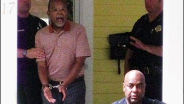 In this photo taken by a neighbor Thursday July 16, 2009 Henry Louis Gates Jr. center, the director of Harvard University's W.E.B. DuBois Institute for African and African American Research, is arrested at his home in Cambridge, Mass. Police say they were called to the home of Gates after a woman reported seeing a man try to pry open the front door. (AP Photo/Demotix Images, B. Carter