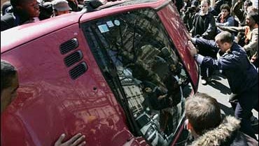Protesters turn over a car after the motorist drove through a crowd of protesting students on Paris' Left Bank on Friday, April 7, 2006, injuring seven people. Furious demonstrators overturned the car and tried to kick its windows out. France's students have been protesting for weeks over a new law that will make it easier for companies to hire and fire people under age 26.