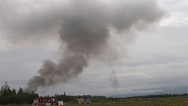 A plume of smoke is seen after a plane crashes on the Elmendorf Air Force in Anchorage, Alaska, July 28, 2010.