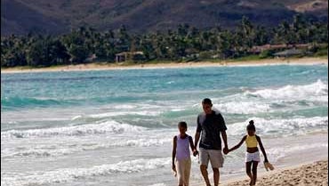 In this Aug. 12, 2008 file photo President-elect Barack Obama walks the beach with his daughters Malia, 10, left, and Sasha, 7, during his vacation in Kailua, Hi. Places that U.S. presidents have called home often become major tourist attractions, from estates at Mount Vernon and Monticello, to Hodgenville, Ky., where Abe Lincoln's log cabin once stood. But if you want to see all the places connected to Obama's life story, you'd need to visit three countries, five time zones and six states. (AP Photo/Marco Garcia, File)