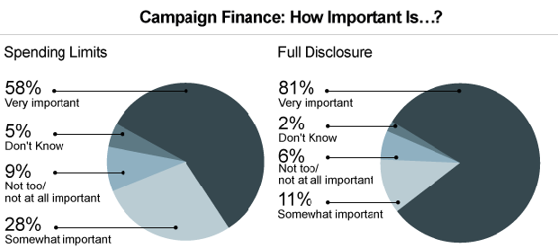 Groups with anonymous donors have poured money into the midterm elections, but Americans overwhelmingly support full disclosure of donations: Eighty-one percent call full disclosure "very important." In addition, 58 percent say it is very important that the amount of money campaigns can spend be limited.