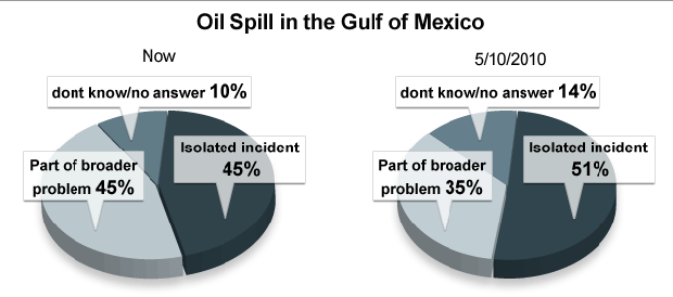 Americans increasingly see the oil spill not as an isolated incident but rather part of a broader problem with offshore drilling. Last month, 51 percent saw the spill as an isolated incident. That figure has now dropped to 45 percent. The percentage that see the spill as part of a broader problem, meanwhile, has increased ten percent to match that 45 percent figure.