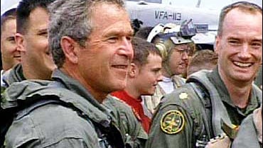 President Bush smiles after landing in a U.S. Navy S-3B Viking on the deck of the USS Abraham Lincoln, in this image from video, Thursday, May 1, 2003, in the Pacific Ocean off the coast of California. The S-3B Viking is dubbed Navy One because of its presidential passenger