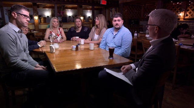Supporters of Roberto Beristain talk with Anderson Cooper at Eddie's Steak Shed in Granger, Indiana.