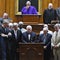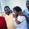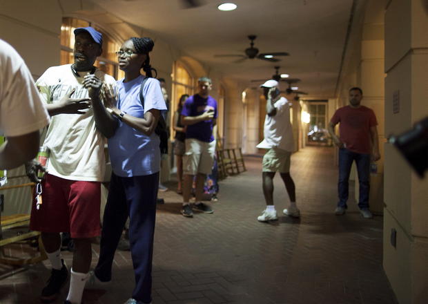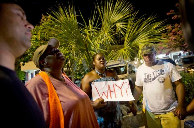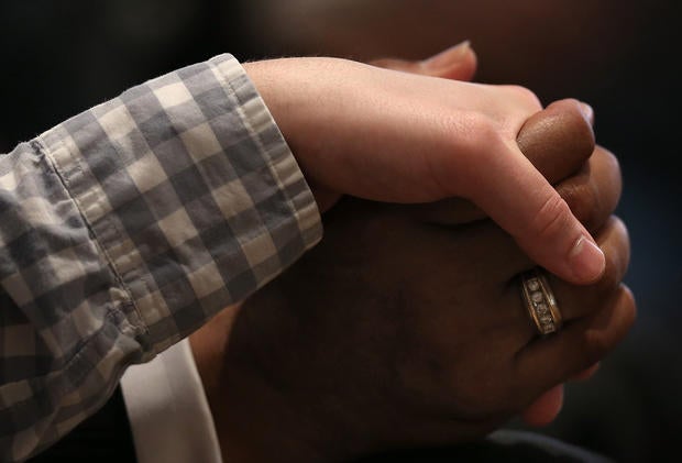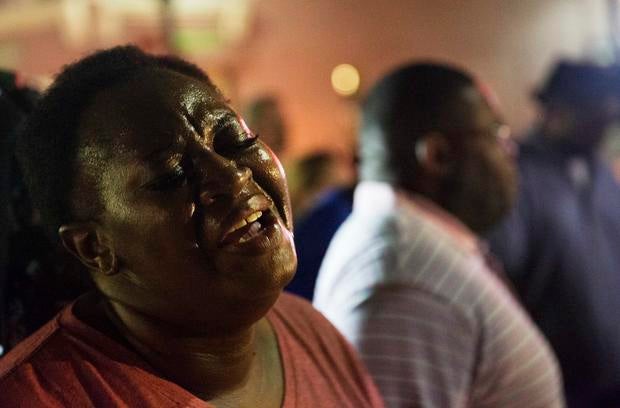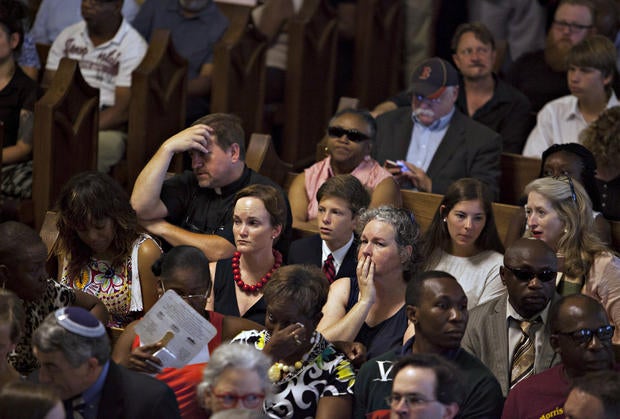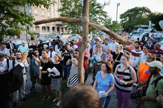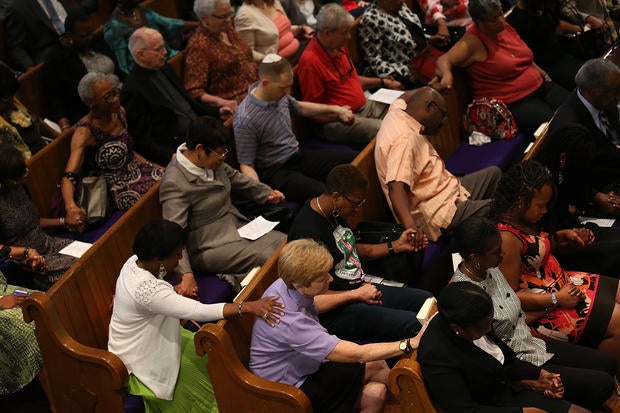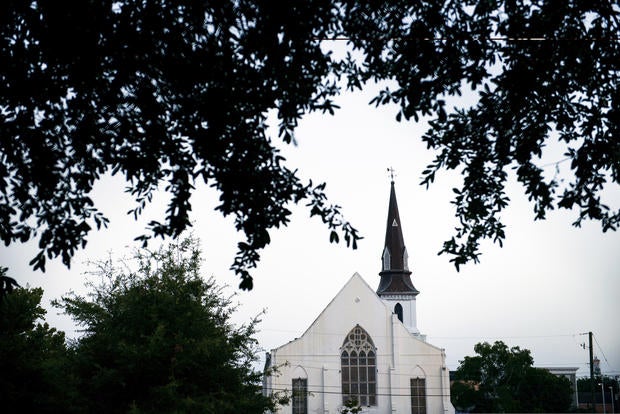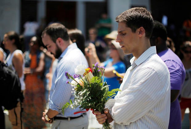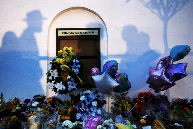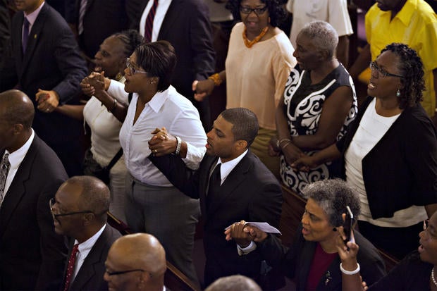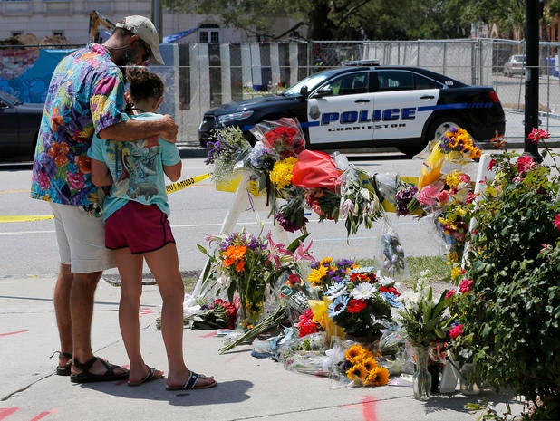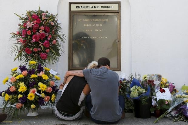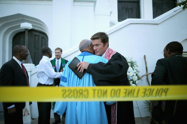 Here, worshippers embrace following a group prayer across the street from the Emanuel African Methodist Episcopal (AME) Church, the scene of the shooting on June 17, 2015.