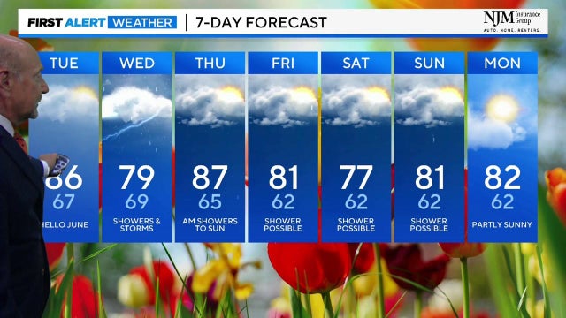 A stray shower or thunderstorm is possible later today but most of your Tuesday will be bright, hot and sticky. Morning temperatures are in the 60s with solid sunshine in store for the first half of the day. A few clouds move in after lunch with isolated storms possible during the afternoon and evening. Some of the storms could have heavy downpours.