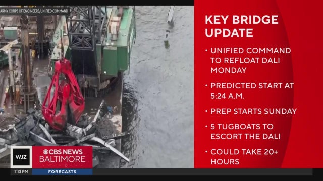 Dali, the cargo ship that crashed into the Francis Scott Key Bridge in Baltimore before its collapse, is set to be refloated Monday after nine weeks of salvage efforts requiring the use of giant floating cranes and explosives.