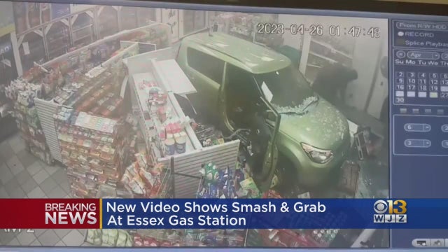 WJZ News obtained surveillance footage of a stolen Kia Soul crashing into a gas station in an attempt to steal an ATM in Essex early Wednesday.