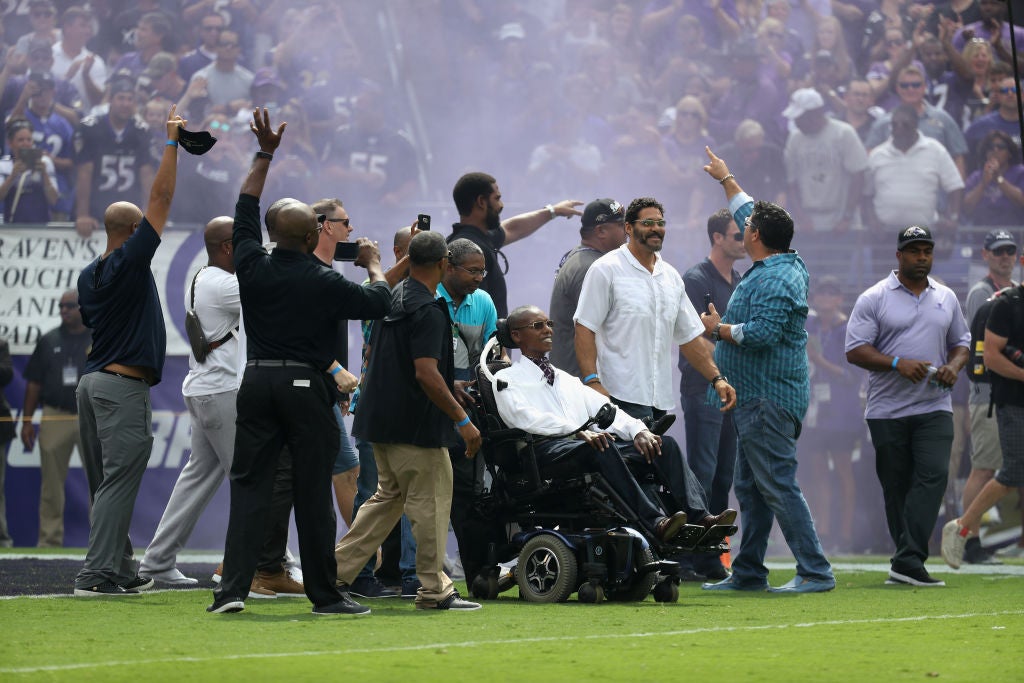 BALTIMORE, MD - SEPTEMBER 17: O.J. Brigance is pushed onto the field with other members of the Baltimore Ravens Super Bowl winning teams before the start of the Ravens and Cleveland Browns game at M&T Bank Stadium on September 17, 2017 in Baltimore, Maryland. (Photo by Rob Carr/Getty Images)