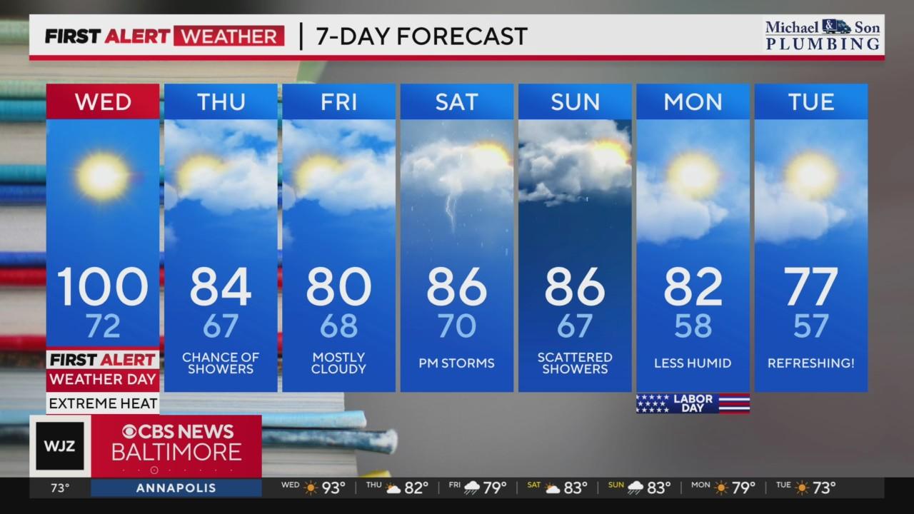 Temperatures will steadily rise throughout the day until we reach 100 degrees. Please limit time in the heat and remember to stay hydrated and wear cool clothing. WJZ has issued an alert day