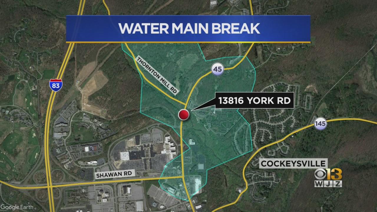 The water main break happened in the 13800 block of York Road near Thorton Mill Road in Sparks, Maryland, on Monday.