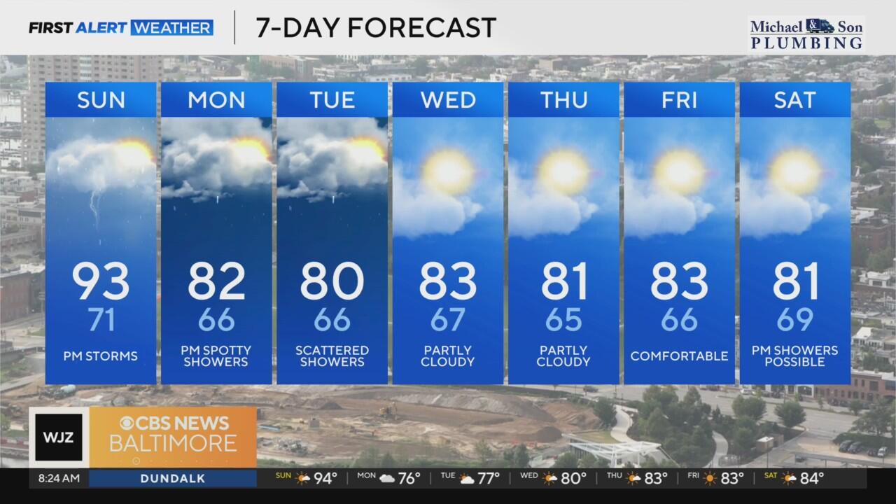 Chances for isolated evening storms on your Sunday, temps peak in the 90s