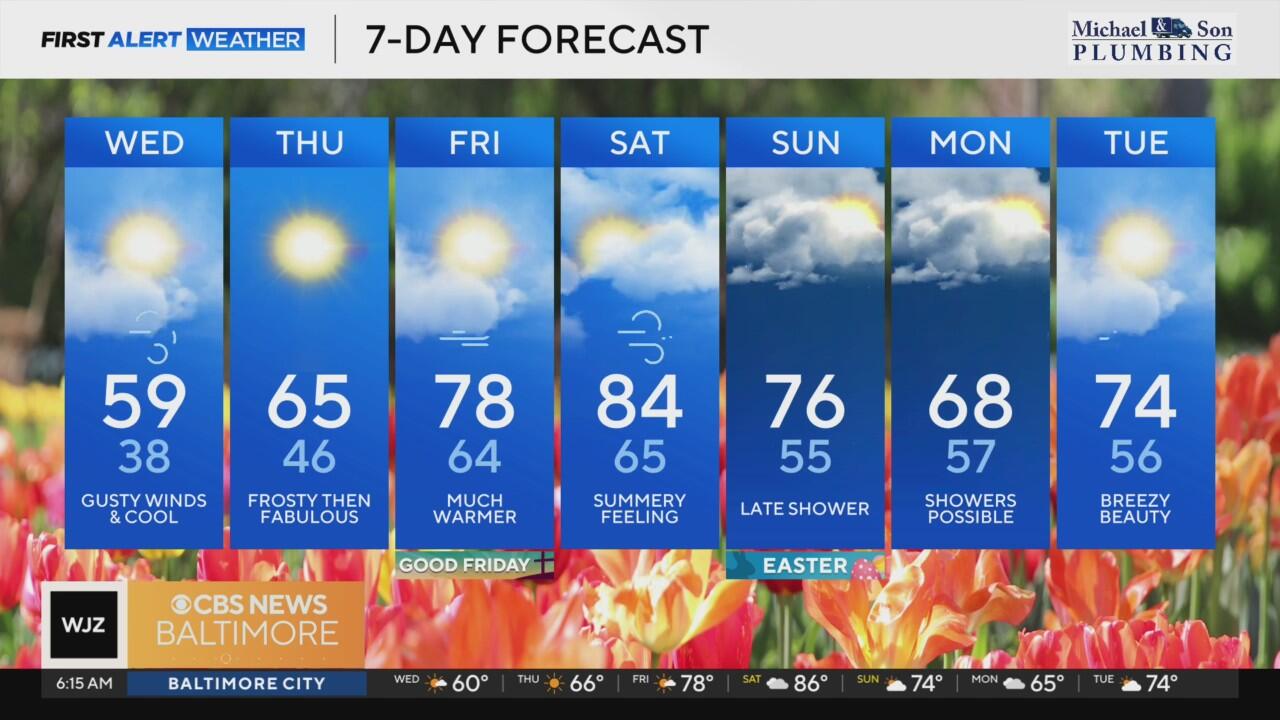 Wednesday will be the chilliest day of the week. Temperatures stay in the mid to upper 50s through the day. It'll be another brisk, however dry, day. If you're heading to the Baltimore Orioles home game Wednesday evening, layer up.