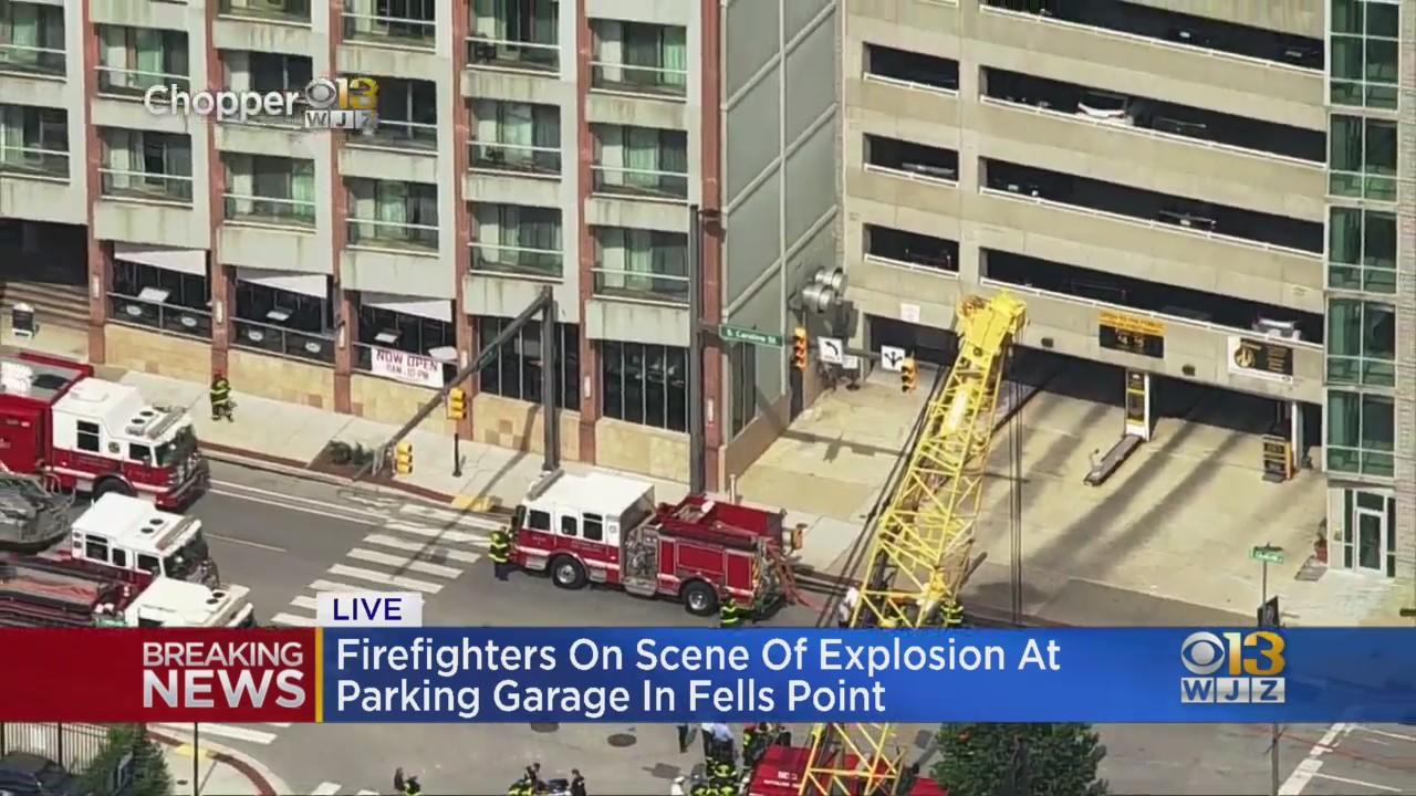 Firefighters are responding to an explosion at a parking garage that injured two people in the Fells Point area, according to authorities.