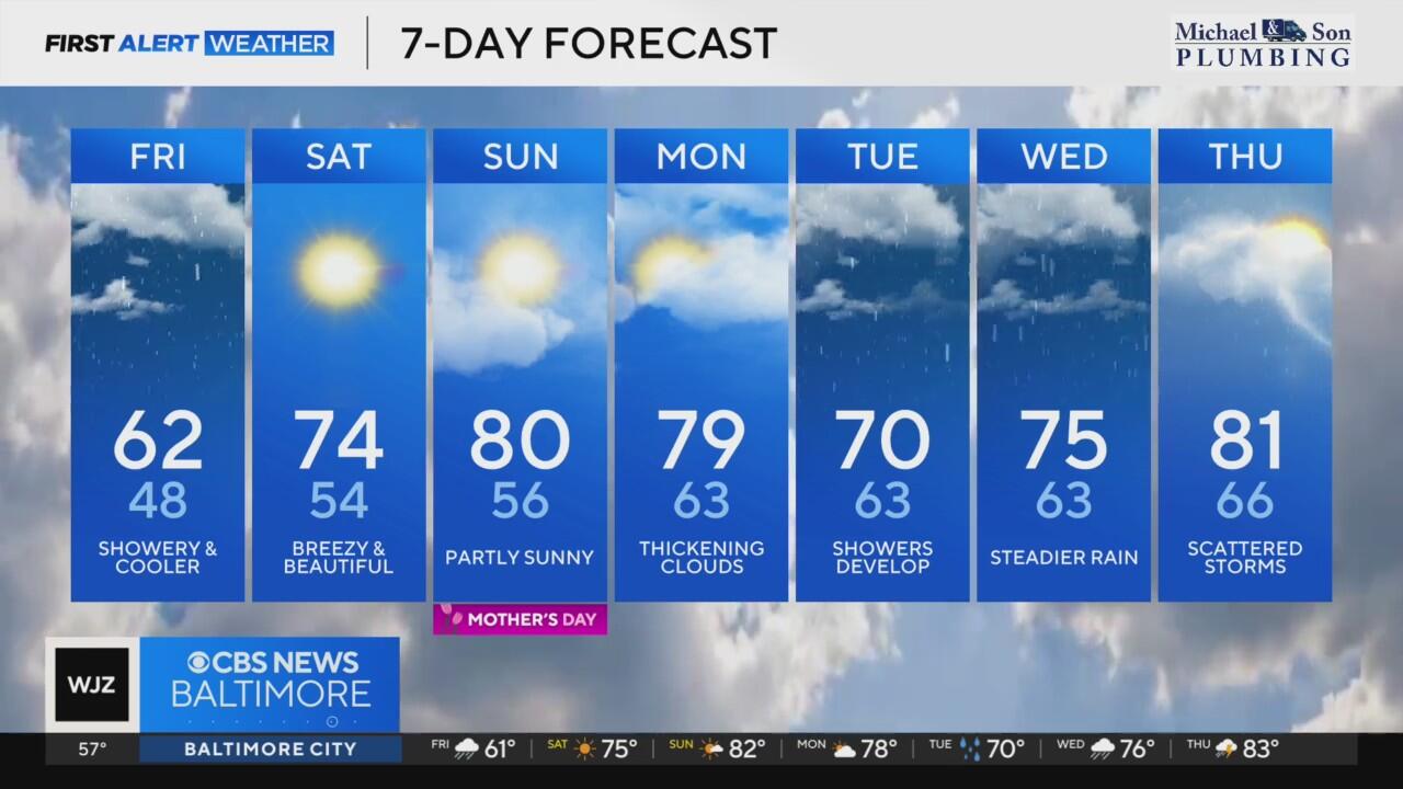 Rain gradually becomes more hit-or-miss from west, to east, across Maryland after 2 p.m. Temperatures remain stuck in the 50s and lower 60s in many neighborhoods, under lots of clouds.