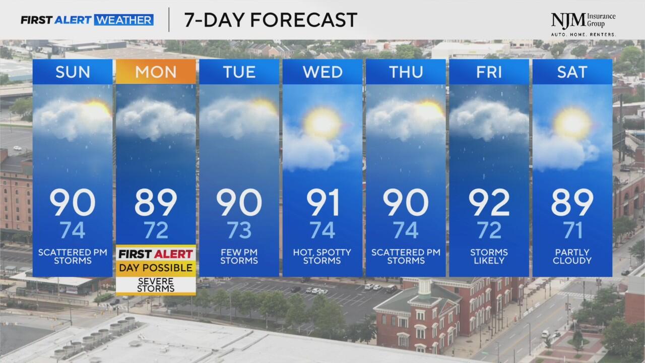 Scattered storms for your Sunday evening, temps peak at 90