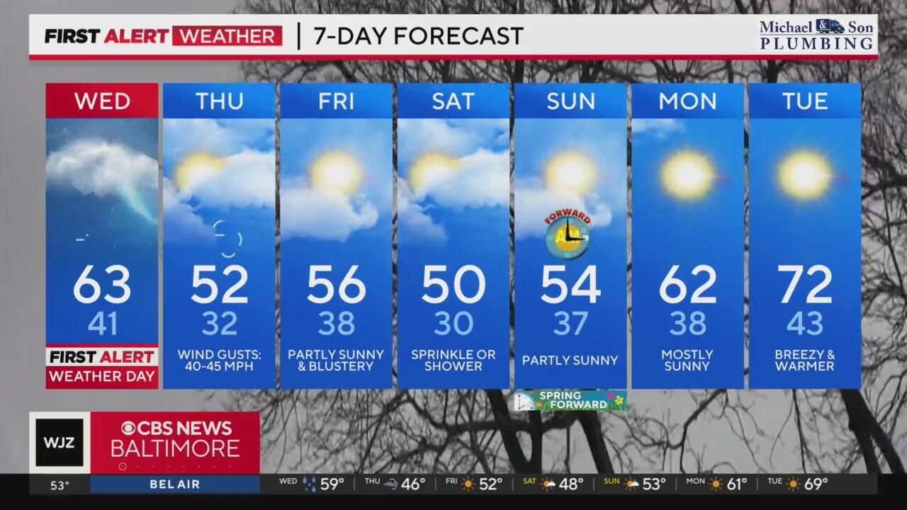A WJZ First Alert Weather Day is in effect for Wednesday due to the potential for strong to severe storms in the afternoon. Winds will increase throughout the morning and afternoon, blowing from the south with frequent gusts over 40 mph possible.
