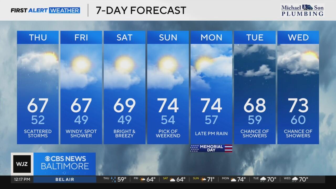Spotty showers and storms will redevelop in Maryland on Thursday afternoon as the temperature warms.