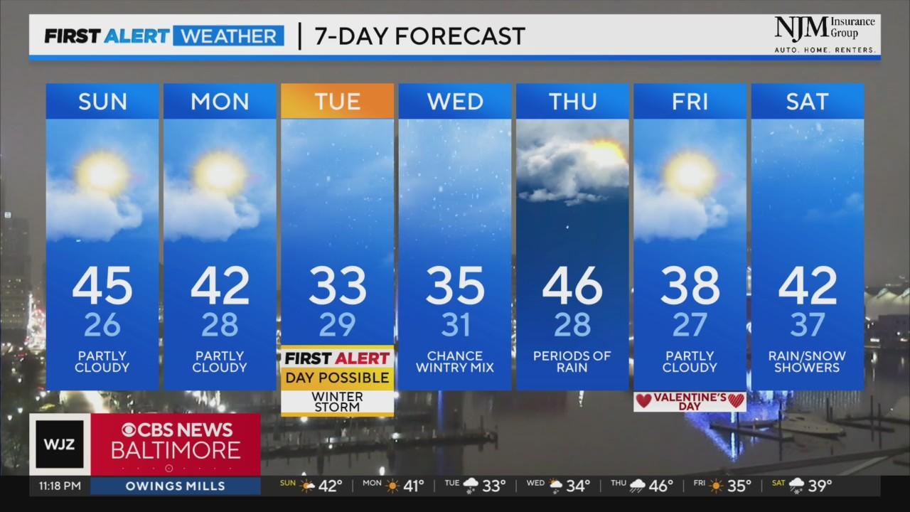 Parts of Maryland will see sunshine on Sunday with afternoon highs in the mid to upper 40s.