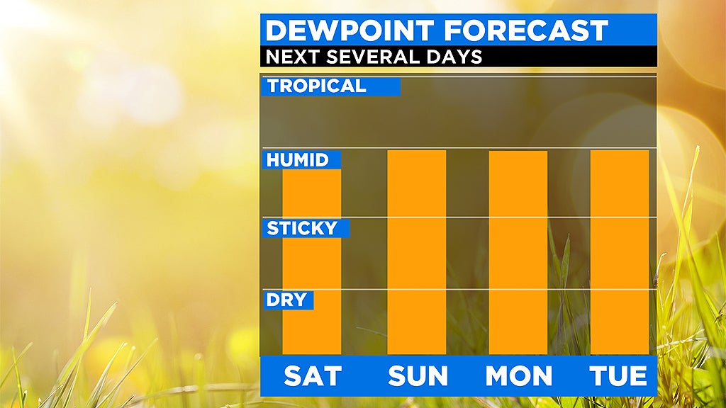 Daily dew points will be well into the 60's for this entire stretch, adding an uncomfortable edge to the swelter. Heat indices (feels like temperatures) could reach near 100 on Saturday and again next Tuesday and Wednesday.