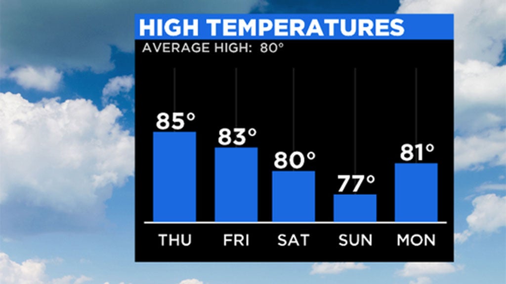 Once the stalled front sweeps to the southeast, drier, cooler air will finally make its return. Thursday will land in the mid 80's while Friday-Sunday hovers around 80°!