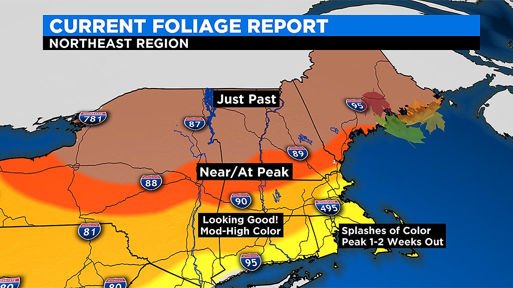 This area is now largely in peak color, albeit with some leaf drop after Wednesday night's wind event. This weekend would be a terrific time to travel west to the Berkshires or north to the Monadnock or Lake Winni regions. There is also a second wave of color now happening in coastal and parts of interior Maine as well.