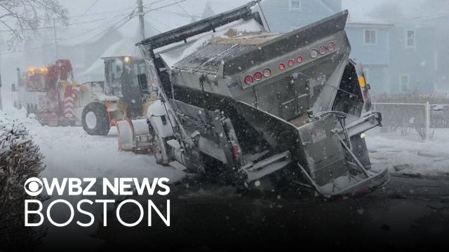 Plow truck gets swallowed into sinkhole during blizzard in Massachusetts