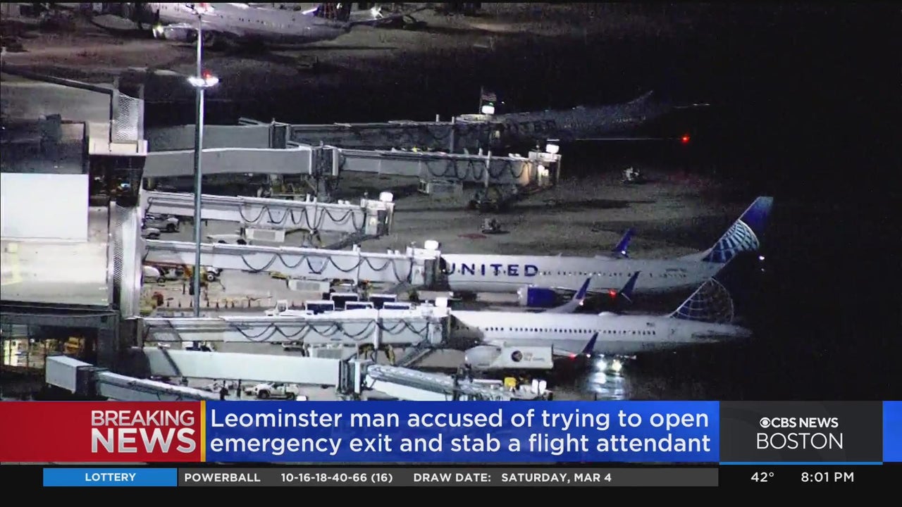 A Leominster man is accused of trying to stab a flight attendant and open a cabin door during a flight to Boston. WBZ-TV's Tammy Mutasa reports.