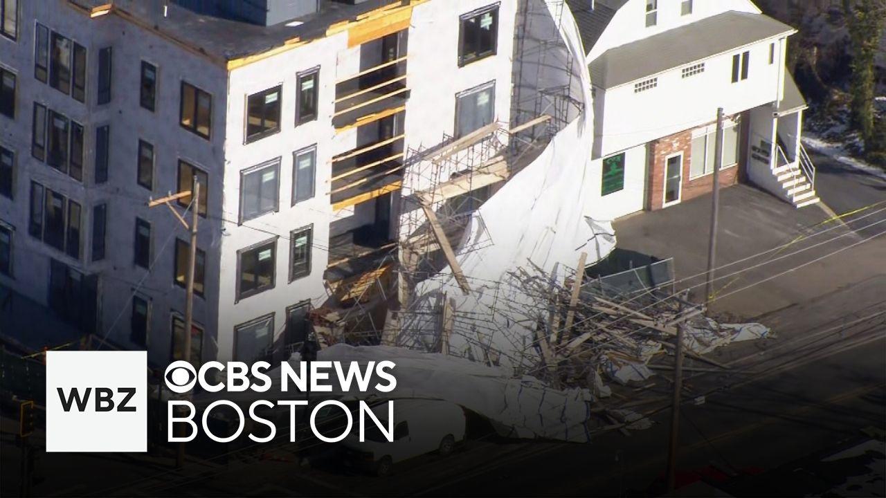 Scaffolding at a construction site in Quincy collapsed Tuesday as strong wind gusts battered Massachusetts. WBZ-TV's Paul Burton reports.