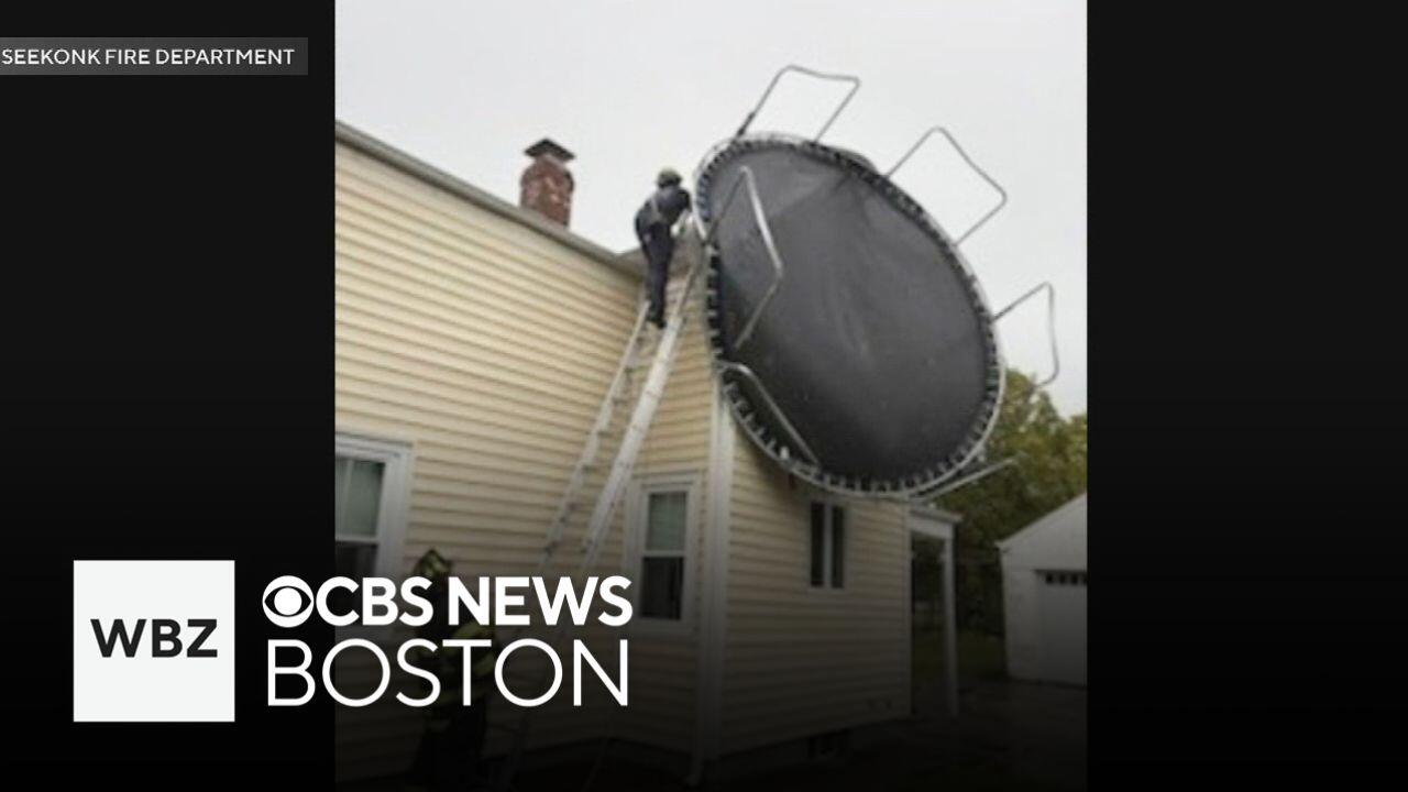 Firefighters had to help remove a trampoline that was blown onto the roof of a Seekonk, Massachusetts home during a storm.