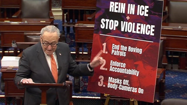 Senate Minority Leader Chuck Schumer spoke on the chamber's floor ahead of a procedural vote to advance a government funding package. Schumer said the bill to fund the Department of Homeland Security "still needs a lot of work" and listed out three goals Senate Democrats have agreed on to "rein in ICE and stop the violence."