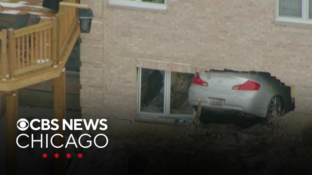 A view from CBS Skywatch showed the car fully lodged inside the ground level of the home, where it crashed through the brick exterior wall.