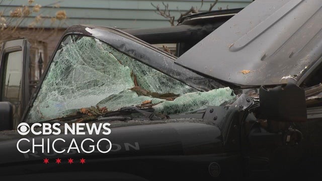 Amid strong winds that topped 50 mph Thursday night, a large tree fell on two cars in Chicago's Lakeview East neighborhood, sending neighbors running outside.