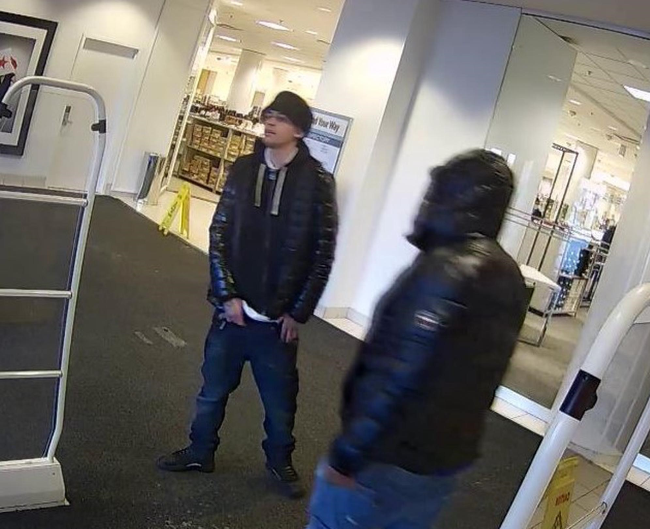 One of the suspects can be seen wearing a black winter hat, diamond earrings, a black puffer jacket with a dark Polo fleece zip-up underneath, dark blue jeans, and dark tennis shoes.