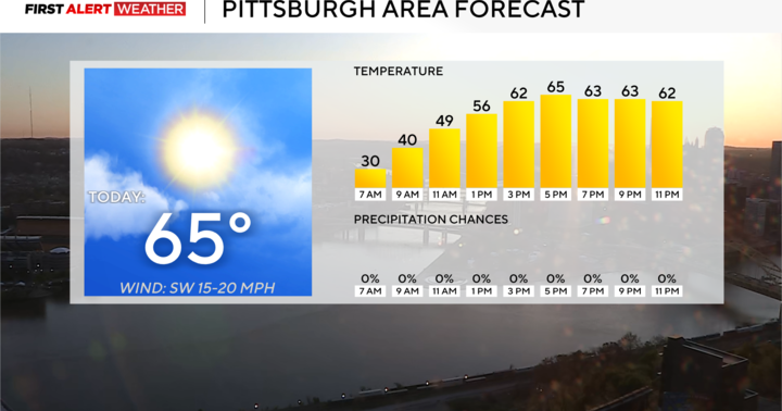 Wednesday: Partly cloudy, breezy and very warm. High 60.