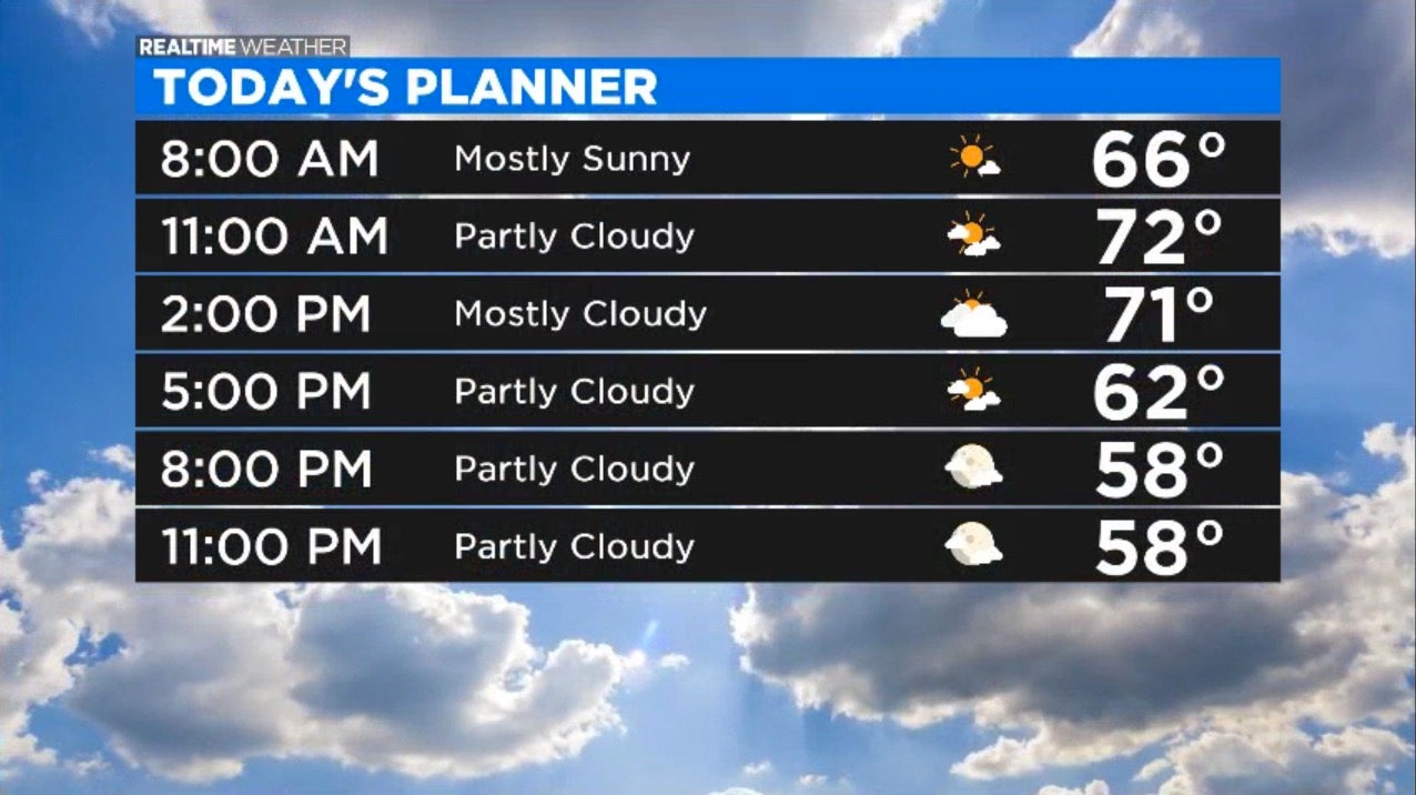 Saturday: Partly cloudy and breezy. 75.