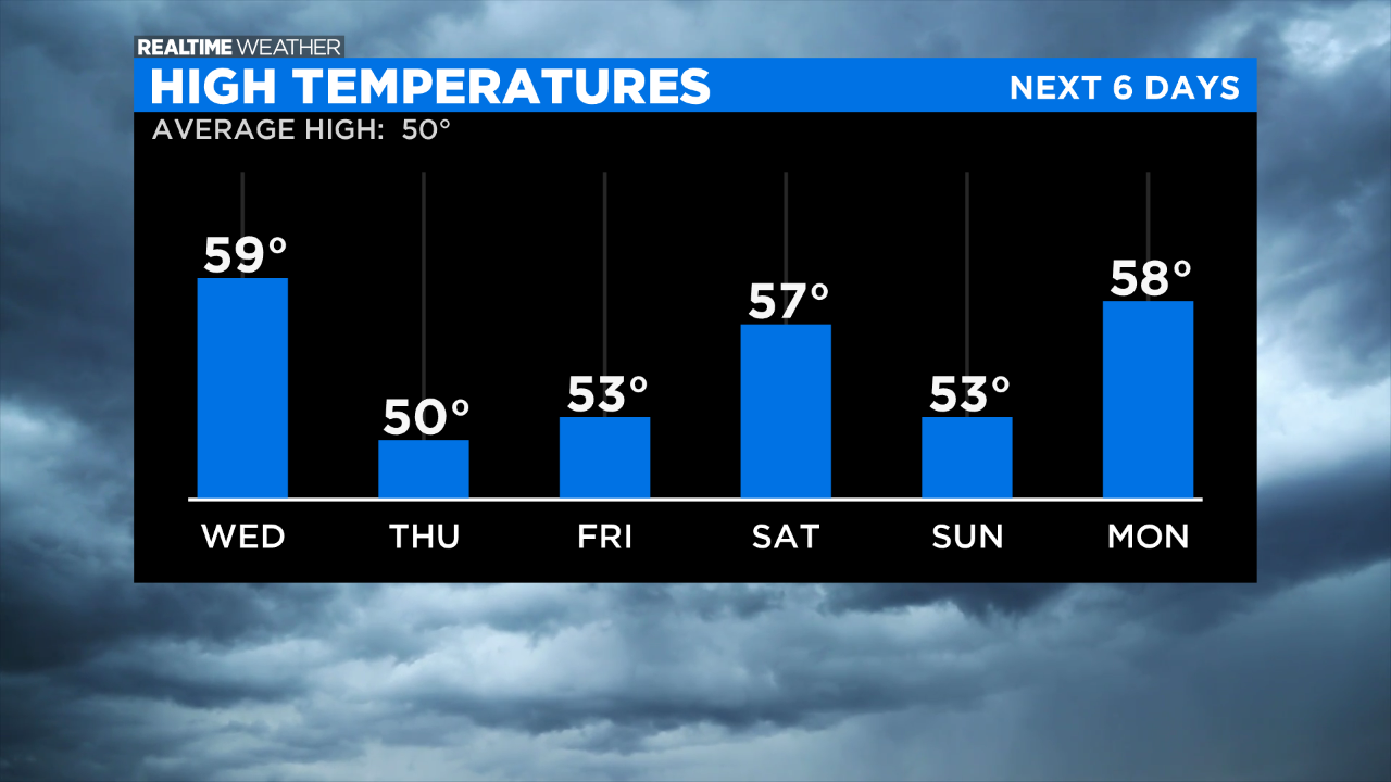 Wednesday's temperatures will be near 59 degrees with cloudy skies. A few showers are possible throughout the day.