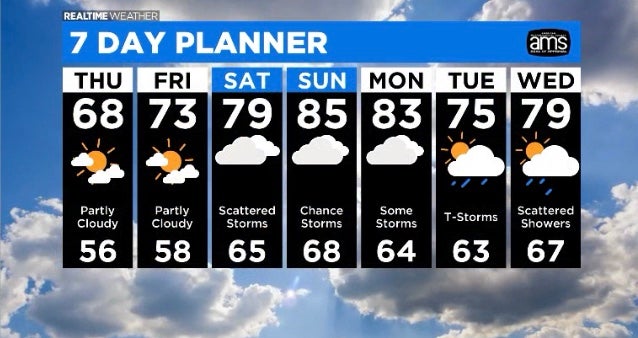 By Sunday temperatures are expected to be in the mid 80s. Scattered showers and storms are possible on Saturday and Sunday.