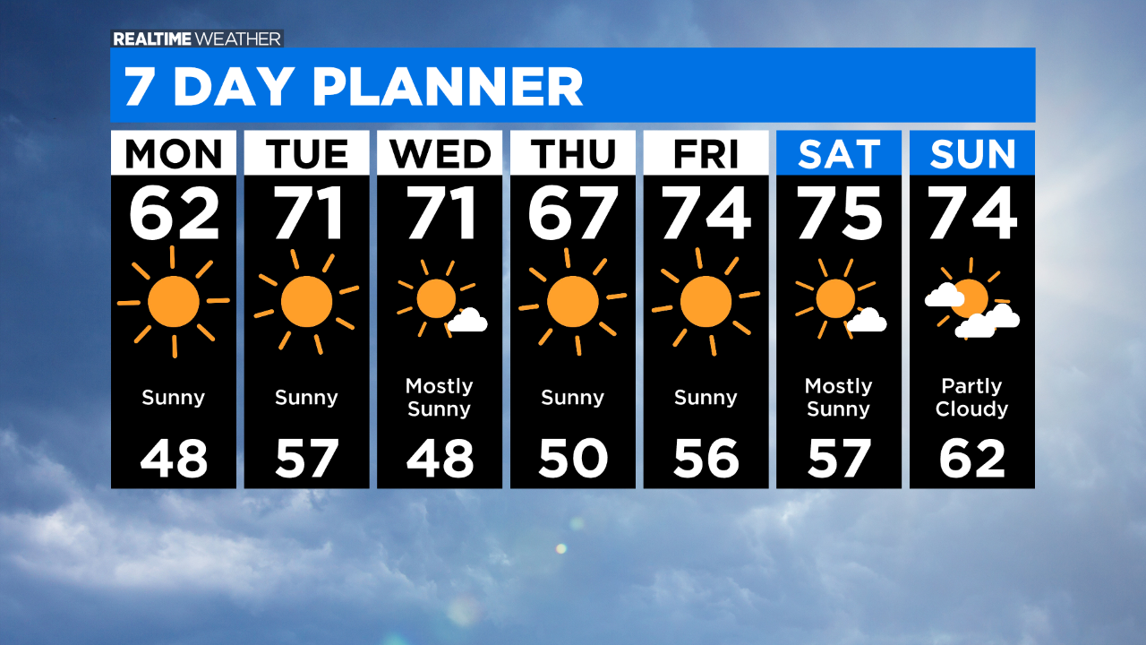 By Tuesday, temperatures will reach the low 70s and continue throughout the week.
