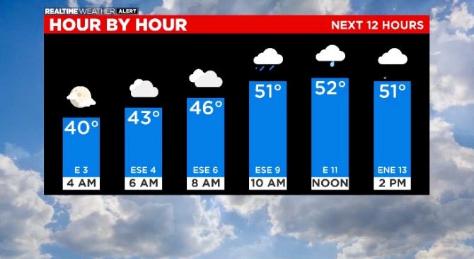 Temps in the low to mid 50s Sunday and Monday with rain ending by Monday afternoon. More rain is possible Monday night.