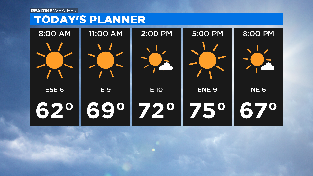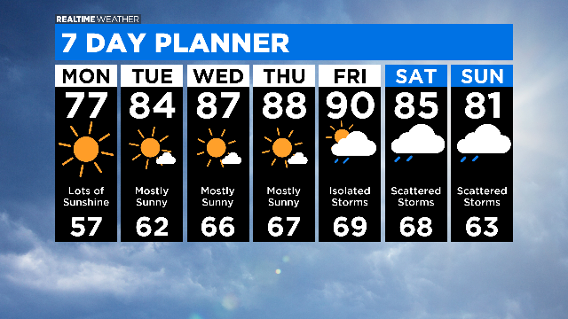 By Tuesday, temperatures will climb to the 80s and continue through Thursday. Isolated showers are possible on Friday and storm chances increase for the weekend.