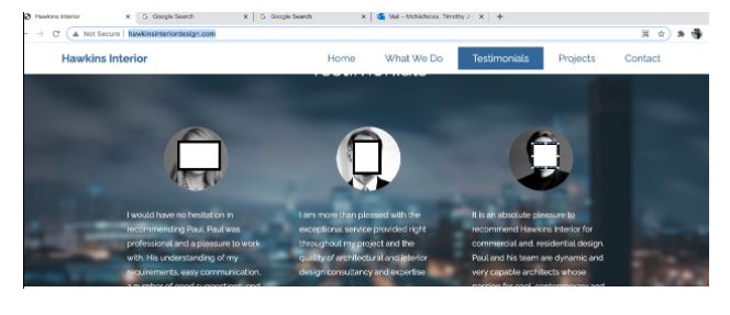 Below is a screen grab from the "design company" website. It includes these testimonials, with photos of three people [we've covered their faces to protect their identity]. However, through a Google photo search, we learned that at least one of them belongs to someone else with a different name, living halfway around the world.