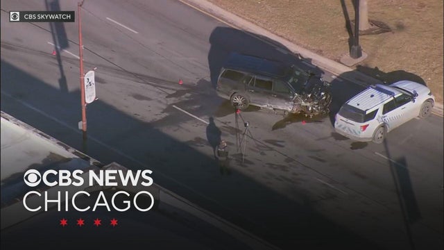 A stolen car hit and wrecked a Chicago police squad car early Monday morning in Wrigleyville.