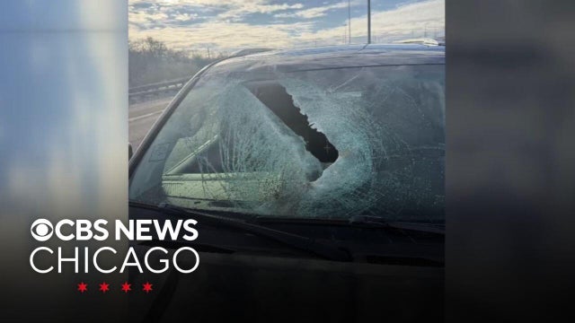 A plumbing worker's windshield was damaged Friday afternoon when a chunk of snow or ice fell from a semi-truck in front of him as he was driving in Chicago's far northwestern suburbs.