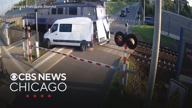 A terrifying crash when a train struck a van on the tracks in Poland was caught on video. Miraculously, no one was hurt.
