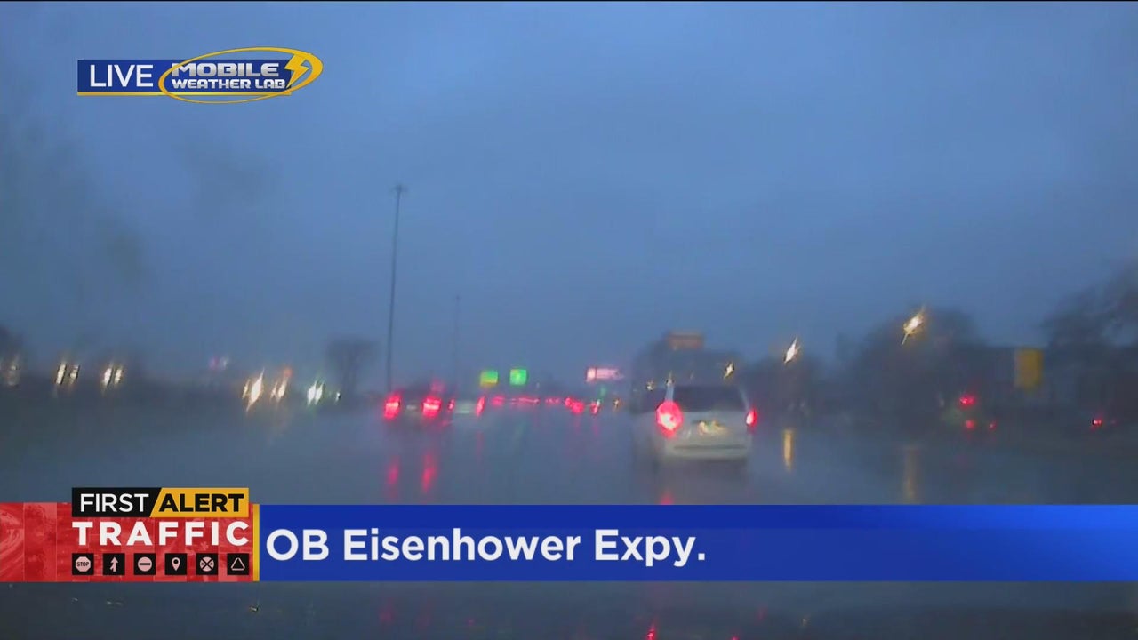 CBS 2's Mobile Weather Lab captured low visibility on the outbound Eisenhower Expressway along with other roadways. Wet roadways are causing dangerous driving conditions.