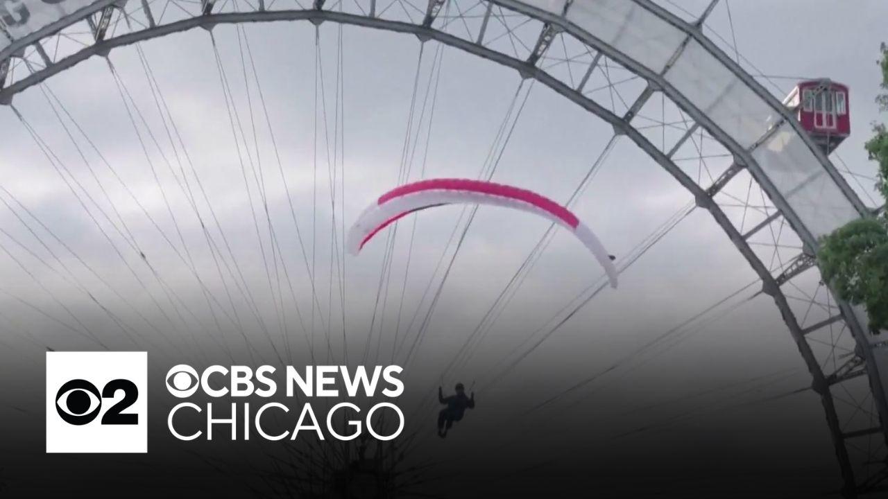 Extreme sports athlete Roland Brunnbauer wanted to push himself a little, so he paraglided from a Ferris wheel. Brunnbauer said it was exciting landing in the city near busy roads.