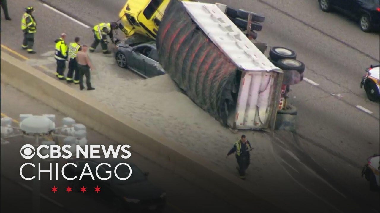 A truck flipped over on top of a car and spilled gravel on the Eisenhower Expressway in Chicago’s western suburbs early Monday morning.