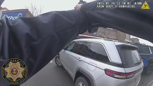 Douglas County Sheriff's deputies block suspect driving a stolen car from striking pedestrians in a King Soopers parking lot.