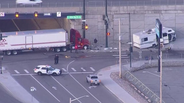 One person was injured in a crash between a semi and an RV on the westbound I-70 ramp to North Holly Street on Tuesday morning.